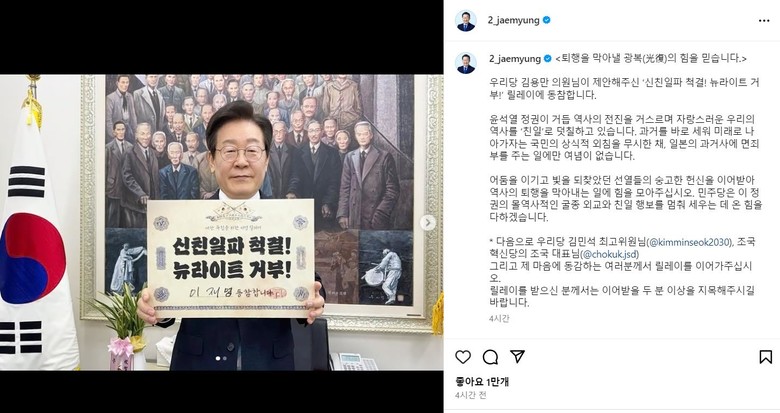 이재명 대표는 김용만 의원이 제안한 신친일파 척결, 뉴라이트 거부 릴레이에 동참하겠다며 해당 문구가 적힌 피켓을 든 사진을 자신의 인스타그램에 올렸다.이 대표는 퇴행을 막아낼 광복(光復)의 힘을 믿습니다라는 제목의 글에서 윤석열 정권이 거듭 역사의 전진을 거스르며 자랑스러운 우리의 역사를 '친일'로 덧칠하고 있다며 민주당은 이 정권의 몰역사적인 굴종 외교와 친일 행보를 멈춰 세우는 데 온 힘을 다하겠다고 말했다.릴레이 후속 주자로 민주당 김민석 최고위원과 조국혁신당 조국 대표를 지목했다.