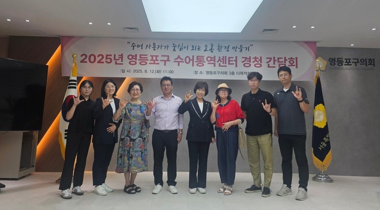 [영등포구 세계타임즈=이장성 기자] 청각장애인의 원활한 의사소통과 정보 접근권 보장을 위해 영등포구의회 이순우 의원(국민의힘, 당산1동, 양평1,2동)이 2025년 8월 12일(화) 오전 11시, 영등포구의회 3층 다목적회의실에서 「영등포구 수어통역센터 경청 간담회」를 개최했다.