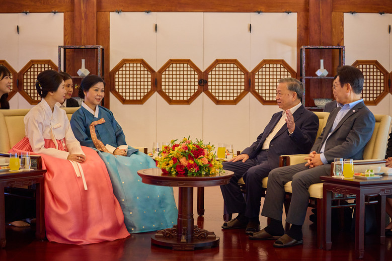 이 대통령은 양국의 문화적 친밀감을 언급하며 "한국과 베트남은 떼려야 뗄 수 없는 관계로, 앞으로 상생 협력을 위해 적극 노력하자"고 말했다.이에 럼 서기장은 "양국의 협력 관계를 더 발전시켜 나가자"고 화답했다.럼 서기장 부부의 기호를 고려해 가진 차담에서 김 여사는 '좋은 차는 좋은 친구와 함께 마셔야 더 맛있다'는 베트남 속담을 언급하며 "럼 서기장 부부와 차를 나누니 친밀하게 느껴진다"고 말했다.