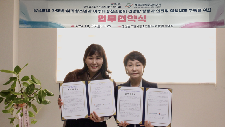 이번 업무협약을 계기로 경상남도일시청소년쉼터와 김해글로벌청소년센터는 경남도내 가정밖‧위기청소년과, 이주배경청소년을 위해 상담, 교육, 행사프로그램을 협업하여 운영하고 청소년 관련 정보 및 자원 활용에 상호 협력할 예정이다.