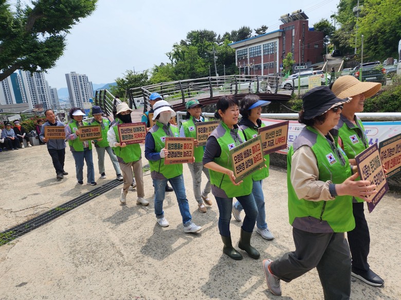 이날은 시민, 회원 90여 명이 참여한 가운데 시민들이 이용하는 교방천 돌다리를 닦고 하천 내 이끼와 부유물 제거, 보행산책로에서 각종 생활쓰레기를 수거했다.