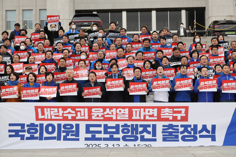 국민이 위임한 권력을 독재의 칼로 휘두르는 자가 단 한 순간이라도 대통령 자리에 머물러서는 안 된다"며 "그 자리에 있는 1분 1초가 대한민국의 치욕이며, 국민에 대한 모욕"이라고 말했다.민주당 의원들은 국회에서 출발해 마포대교, 마포역, 애오개역, 충정로역, 서대문역을 거쳐 광화문까지 도보로 이동한다.도보 행진 거리는 약 8.8㎞로, 1만4천여보가 소요된다고 민주당은 설명했다. 당 의원들과 당직자, 보좌진을 포함해 200명 이상이 도보 행진에 참여할 것으로 전해졌다.