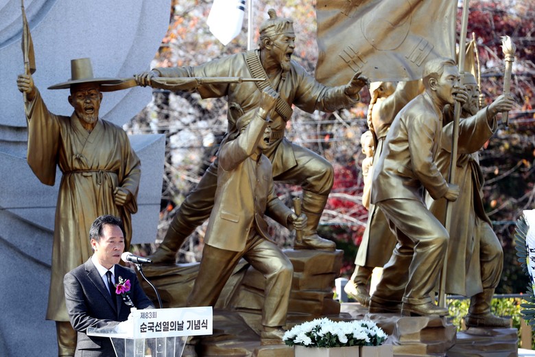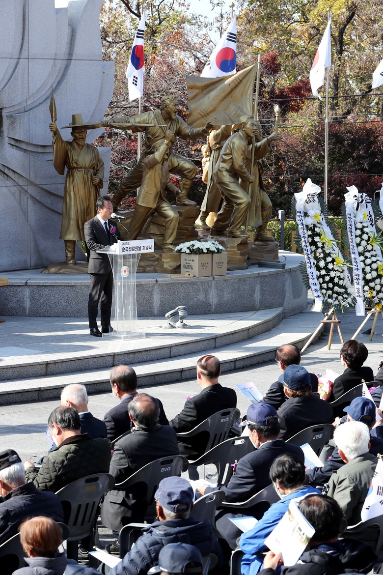 [충북 세계타임즈=이현진 기자] 제83회 순국선열의 날 기념식에서 충북도의회 황영호 의장이 추모사를 하고 있다.(17일 오전 11시 삼일공원 항일독립운동 기념탑)/충북도의회 제공