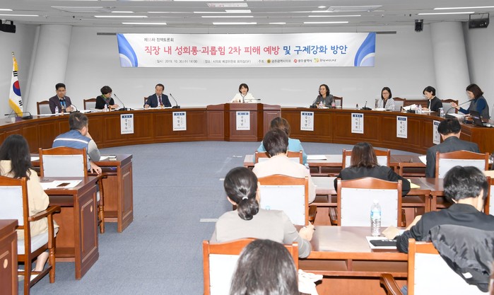 광주시의회는 광주광역시, 광주여성재단과 함께 30일(수) 오후 2시 시의회 5층 예산결산특위실에서 ‘직장 내 성희롱·괴롭힘 2차 피해예방 및 구제강화를 위한 정책토론회’를 개최했다.