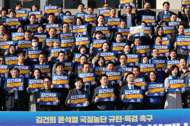 [세계타임즈 = 심귀영 기자] 더불어민주당은 김건희 여사 특검법을 관철하기 위한 전 국민 서명운동을 시작하는 등 총력전에 나섰다.박찬대 원내대표는 국회의사당 계단 앞에서 열린 민주당 서울시당의 특검 촉구 천만인 서명운동본부 발대식에서 법 위에 군림하며 국정농단하는 김건희를 특검으로 심판할 수 있도록 우리 국민께서 적극 참여해달라고 당부했다.박 원내대표는 윤석열 대통령을 향해 김건희 특검이 정치 선동이고 반헌법적인 발상이라면 박근혜 특검을 지휘했던 윤 대통령은 반헌법적 정치 선동을 앞장선 장본인 아닌가라고 지적했다.윤 대통령은 대통령 자격이 없다며 가족과 주변 사람에게 특혜를 주는 것은 국법을 무너뜨리는 일이라면서도 김건희 특검은 거부하는 모순은 국민을 바로 개돼지 취급하며 무시하는 것"이라고 공세를 폈다.전현희 최고위원은 천만 시민들이 함께 윤석열 정권을 심판하고 끝장내기 위해 함께 모였다. 천만 서명을 반드시 함께해서 윤석열 정권을 반드시 끌어내자라고 목소리를 높였다.민주당은 이날부터 김 여사 특검법 재표결이 예정된 오는 28일까지 집중 서명운동을 할 예정이다. 이 기간 전국 각지에 서명운동본부를 설치해 상시 운영하고 현수막 QR코드를 활용해 온라인 서명운동도 병행한다.민주당은 이날 국민의힘 이탈표를 끌어내기 위해 김 여사 특검법 수정안을 제출하겠다고 배수진을 치며 명태균 게이트 등으로 수사 대상을 좁히겠다고 밝혔다.당의 명태균 게이트 진상조사단 부단장인 김병기 의원은 회의에서 명태균 게이트는 현직 대통령의 위법한 공천개입을 밝히는 명백한 증거라고 주장했다.민주당은 자동응답시스템(ARS) 기반 여론조사와 관련한 명태균 씨의 음성 녹음 파일을 공개했다.2022년 3월 초 대선 직후 녹음된 해당 파일에는 명 씨가 전화를 쫙해놨다. 그다음에 진짜 여론조사 전화를 받는 상대 지지자는 전화를 안 받지 않겠느냐라는 취지의 언급을 하는 육성이 담겼다.이 발언은 명 씨가 실질적으로 운영하던 미래한국연구소가 2022년 지방선거를 앞두고 국민의힘 책임당원들에게 미리 ARS를 돌려 지지 성향을 파악한 후, 상대측 지지자들에게 공식 여론조사를 가장한 전화를 걸어 실제 여론조사에는 응답하지 않도록 방해 조사를 한 정황이라는 게 민주당 주장이다.최민희 의원은 지난 8일 대통령이 자신의 배우자를 특별사면할 경우 국회 동의를 받도록 하는 사면법 개정안을 대표 발의했다. 김 여사 특검이 통과돼 설사 사법 처리가 이뤄진다고 해도 대통령이 사면권을 행사할 수 있다는 우려에서 이를 사전에 차단하기 위한 장치를 마련한 것으로 풀이된다.