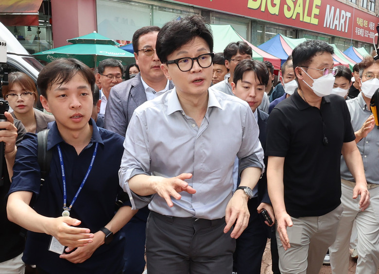 한동훈 국민의힘 대표가 11일 다음 달 16일 구청장 보궐선거가 열리는 부산 금정구 서동미로시장을 방문해 상인들과 인사하며 이동하고 있다. 2024.9.11