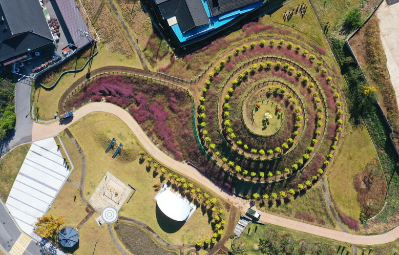 황금실화백나무는 잎이 황금색인 사철나무로 공원 일원에 만개한 핑크뮬리와 어우러져 색다른 장관이 연출되고 있다.