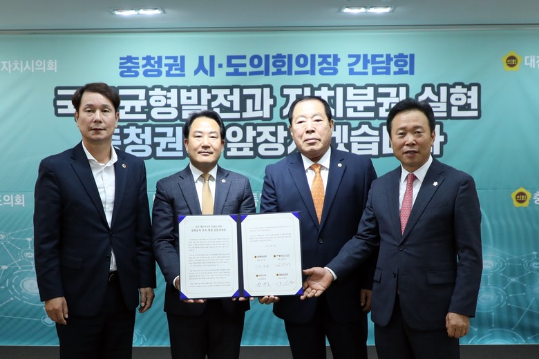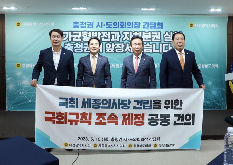 충청권 4개 시도의회 의장단(이하 의장단)은 15일 세종시의회 1층 대회의실에서 충청권 상생 발전을 위한 간담회를 열고 특별지방자치단체 광역의회 구성 계획과 2027년 하계세계대학경기대회 성공 개최를 위한 상호 협력 방안 등을 심도 있게 논의했다.
