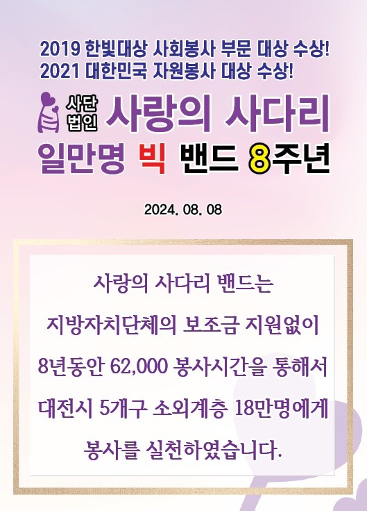 [대전 세계타임즈=이채봉 기자] 대전지역 소외계층을 위해서 매월 15회~20회 다양한 봉사활동을 하고 있는 ‘사랑의 사다리 밴드’가 8일 창립 8주년을 맞았다.