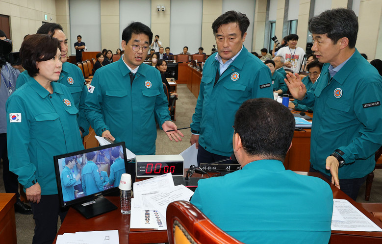 18일 국회에서 열린 행정안전위원회 전체회의에서 국민의힘 조은희 간사를 비롯한 의원들이 이달희 의원의 의사진행 발언을 중단시킨 것에 대해 신정훈 위원장에게 항의하고 있다. 맨 오른쪽은 야당 간사인 더불어민주당 윤건영 의원.[사진=연합뉴스]