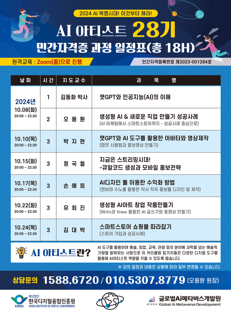 [세계타임즈]최성룡기자 = 한국디지털융합진흥원 부설 글로벌AI메타버스개발원(원장 오용환)은 AI 아티스트 전문가 28기 민간자격증 과정을 개설합니다. AI 시대에 접어들며 기술 발전의 속도가 빨라지고 있는 가운데, 많은 사람들이 자신의 미래에 대한 불안감을 느끼고 있습니다. 이번 과정은 개인이 AI 기술을 배우고 창업 및 전문 강사로 성장할 수있는 기회를 제공합니다.