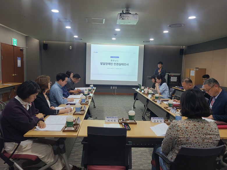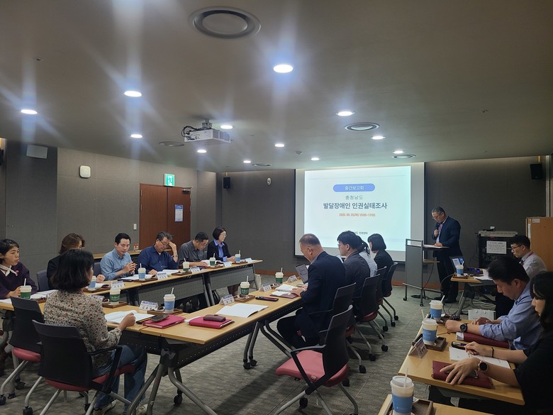 도 인권센터는 25일 도청 문예회관 세미나실에서 자문위원, 수행기관, 도 관련부서 등 20여 명이 참석한 가운데, ‘충청남도 발달장애인 인권 실태조사 연구용역 중간보고회’를 개최했다.
