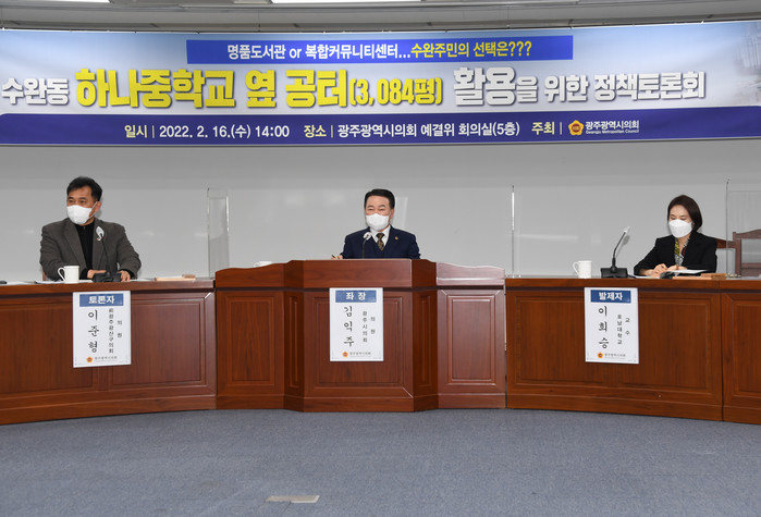 금일 정책토론회는 지난해 김 의원이 광산구청장에 재(再) 도전하기 위해 광산구 전반에 걸쳐 민의를 수렴하던 중, 수완지구 조성 이후 14년 동안이나 방치되어 온 해당 부지에 대한 민원을 접하면서 잉태되었다고 했다. 그리고 민원 내용은 수완동은 물론 인근 신가·신창지구 주민들까지도 그동안 방치되어 온 부지(972번지)에 명품 도서관이나 복합커뮤니티 센터 건립을 바라는 내용이었다.