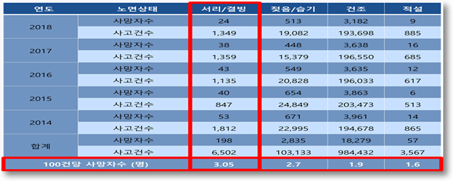 <표 2> 노면상태별 사고 사망자수 (출처:도로교통공단)