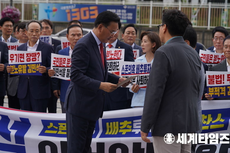 유상범 국민의힘 원내수석부대표가 1일 오전 서울 용산구 대통령실 앞에서 열린 현장 의원총회에서 대통령실 관계자에게 김민석 국무총리 후보자 지명 철회를 요구하는 항의서한을 전달하고 있다.