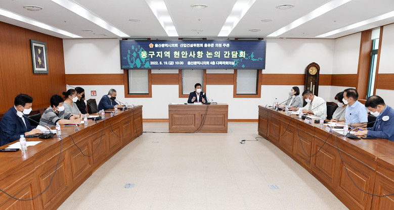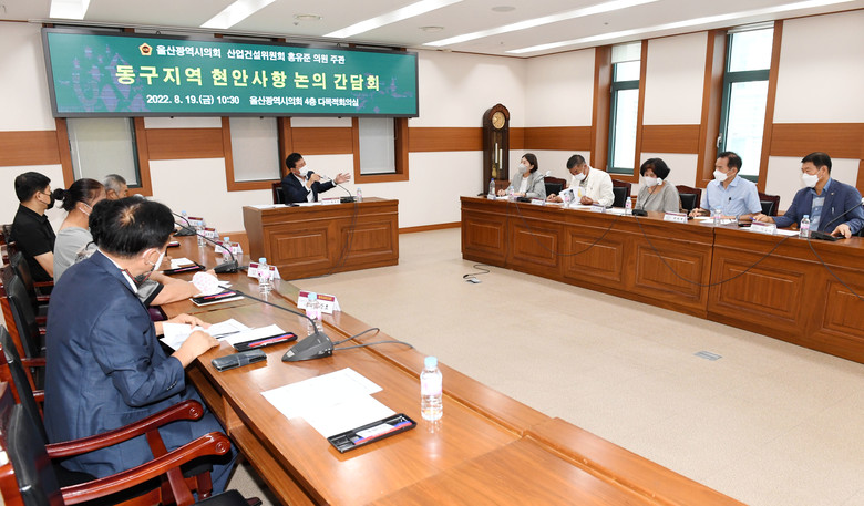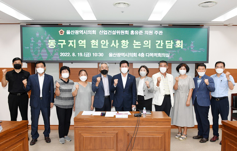 [울산 세계타임즈=이호근 기자] 울산광역시의회 홍유준 의원(산업건설위원회)는 19일 오전 10시 30분 시의회 4층 다목적회의실에서 ‘동구지역 현안사항 논의 간담회’를 개최했다.