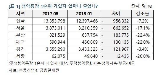 경쟁자도 줄었다. 청약통장 1순위 가입자수는 8.2대책 발표 이후 7.2% 감소했다. 금융결제원에 따르면 청약통장 1순위(주택청약종합저축·청약저축·부금·예금) 가입자는 1,239만7,466명으로 지난 해 8월 대비 95만6,332명이 줄었다. 투기 및 청약과열지역에 해당하는 서울(66만명), 부산(18만명), 대구(13만명), 경기(12만명), 세종(1만2천명) 순으로 감소했다.