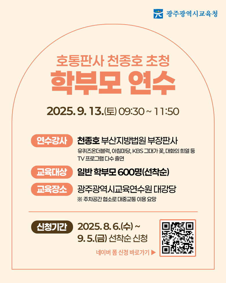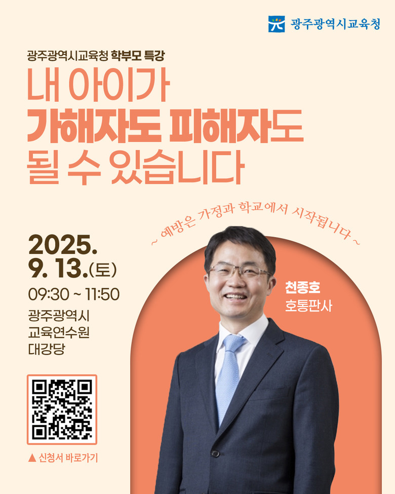 - 9월 13일 오전 광주광역시교육청연수원 대강당…QR코드·학교 등서 신청 [광주 세계타임즈=손권일 기자] 광주시교육청(교육감 이정선)은 오는 9월 13일 오전 9시30분 광주시교육청연수원 대강당에서 학부모를 대상으로 천종호 부산지방법원 부장판사 초청 특강을 진행한다.