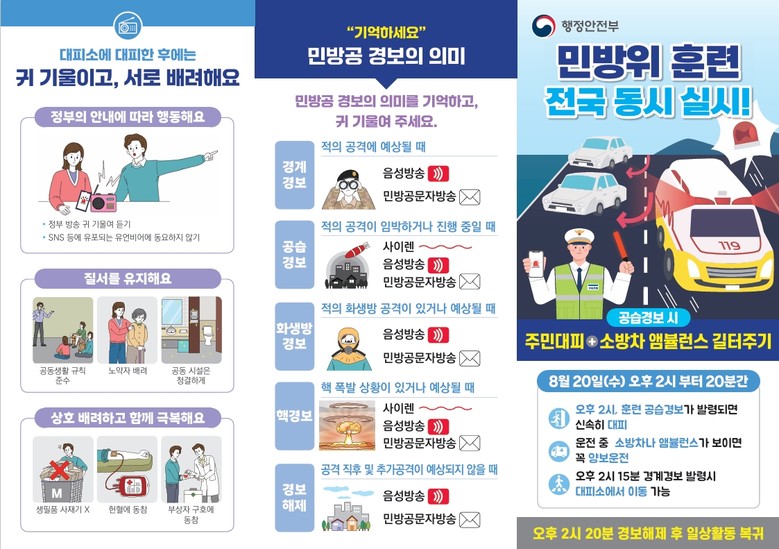 시 관계자는 “고도화되는 북한의 도발과 불안정한 국제정세 속에서 평화를 지키기 위해서는 사전 대비가 필수”라며 “이번 훈련을 통해 국민 행동요령과 생존배낭 준비 등 비상대응 역량을 강화해 달라”고 당부했다.