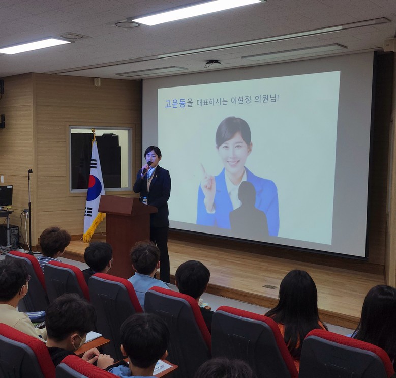 그 외, 이현정 의원은 고운동 신호체계 관련 질문, 민원 해결 사례, 어렸을 적 꿈, 정당 및 선거 관련 궁금한 점 등 학생들의 다양한 질문에 답하며 격의 없는 대화를 이어갔다.