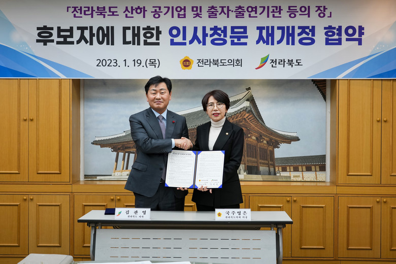 [전북세계타임즈 = 전영숙 기자] 국주영은 전라북도의회 의장과 김관영 전라북도지사는 1월 19일 도의회 의장실에서 ‘전북도 산하 공기업 및 출자·출연기관 등의 장’ 인사청문회 실시 재개정 협약을 체결했다.