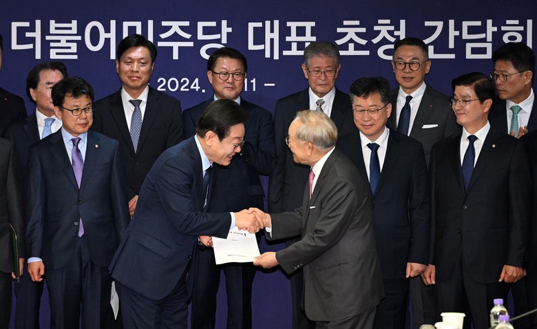 손경식 한국경영자총협회 회장이 11일 오전 서울 마포구 경총회관에서 간담회를 하기 전 이재명 더불어민주당 대표에게 경영계 건의사항을 전달하고 있다. 2024.11.11