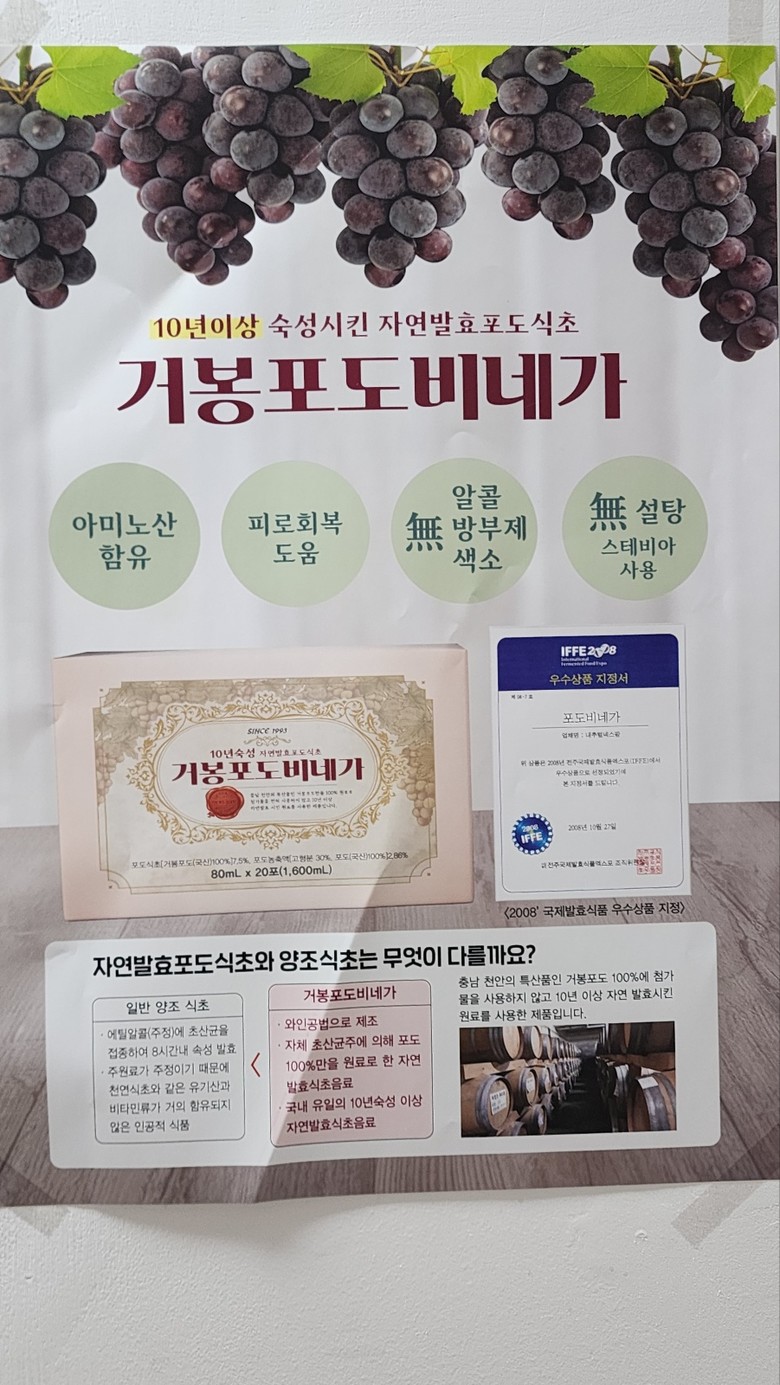 박종화 내추럴넥스팜 회장의 ‘식초 예찬론’은 끝없이 이어진다. 20여 년 전 위암 수술을 받은 포도식초를 먹고 큰 효과를 본 뒤 아예 포도식초영농조합을 인수하고 직접 포도 발효 제품 생산에 나섰다. 현재 연 200t의 천연 발효식초 원액을 생산하고있다.식초는 주정에 초산균을 넣어 수일간 속성 발효한 일반 양조식초(주정초), 과실이나 곡물을 초산균주로 1년 이상 자연 발효한 천연양조식초(발효초)로 나뉜다. 시판 중인 식초 제품 대부분은 발효 기간이 길어야 1년 남짓한데, 이 회사 제품은 입장 거봉포도만을 최단 10년 이상 숙성해 비타민, 미네랄, 유기산 등 40여 종의 영양소를 지녔다고 한다. 오래 발효하되 pH 4.5~5.5의 적정 산도(酸度)를 유지하는 게 핵심 노하우다. 중소기업이라 브랜드 인지도와 유통망에서 열세였으나 최근 협회 안동엽 이사는 본 제품을 전국적으로 대한민국 국민 건강을 위해 홍보에 땀을 흘리고 있다