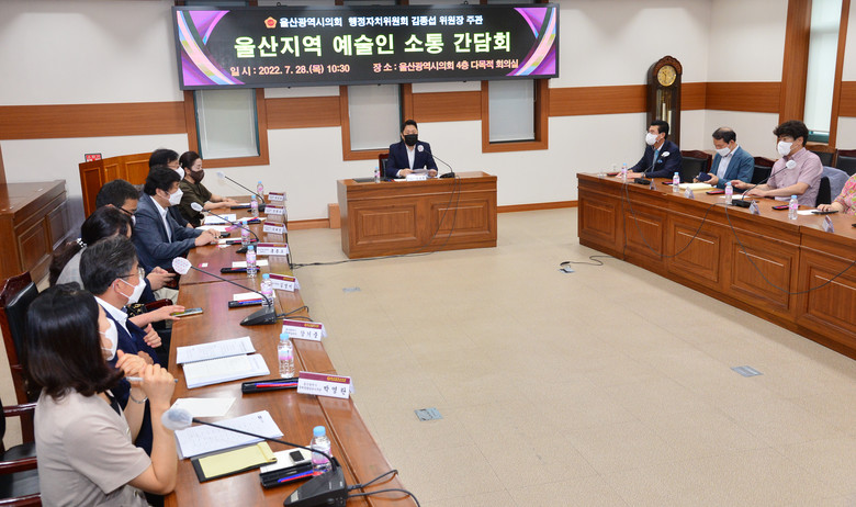 김종섭 위원장은 “코로나19 장기화로 울산의 지역 예술인들이 전시·공연 기회를 갖지 못해 경제적 어려움을 겪고 있다”며 “최근 코로나19 재유행에 지역 문화예술계가 또다시 위축 조짐이 있어 지역 문화예술인과 문화도시 울산을 만들기 위해 문화예술 발전방안을 함께 고민하고자 한다”며 간담회 개최 이유를 밝혔다.
