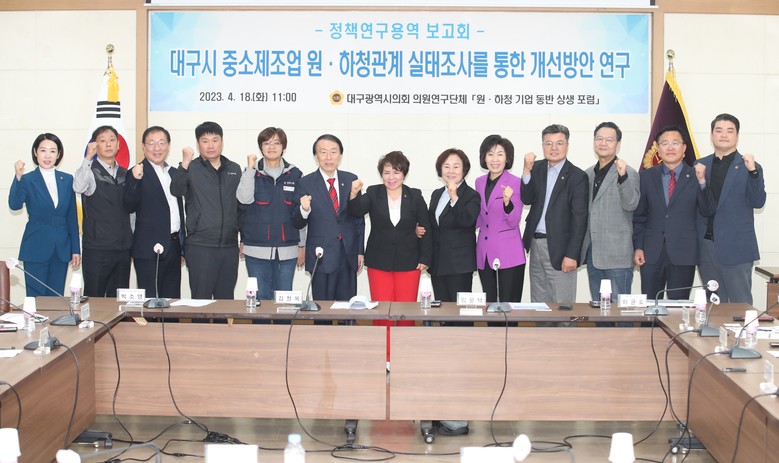 [대구 세계타임즈=한성국 기자] 대구광역시의회 의원연구단체 「원·하청 기업 동반 상생 포럼」(대표 김정옥 의원)은 4월 18일(화) 오전 11시 시의회 3층 회의실에서 소속 의원(대표 김정옥, 간사 박소영, 류종우, 황순자, 하병문, 이태손, 윤권근, 박종필, 허시영, 이영애, 김원규)이 참석한 가운데 정책연구용역 중간보고회를 개최했다.