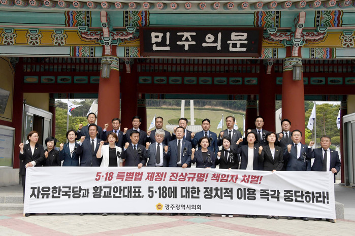 광주시의회 의원 전원은 17일 국립5.18민주묘지에서 성명을 통해 “자유한국당과 황교안 대표는 5.18의 정치적인 이용을 중단하고 5.18망언 3명 의원에 대한 중징계와 5.18의 진실규명을 위해 적극적으로 협조할 것”을 강력히 촉구했다.