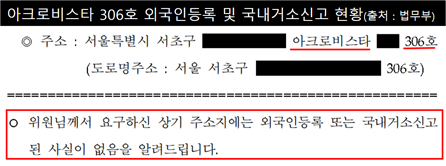 그러나 김남국 의원실이 확보한 법무부 공식 답변에 의하면 2010년부터 2013년 사이 해외교포가 김건희 씨 소유 아크로비스타 306호에 거소지 신고, 외국인등록을 한 사실이 없었다.