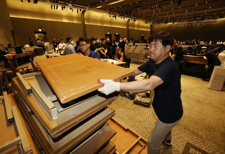 [세계타임즈 = 백진욱 기자] 17일 오후 HWPL 집기설치부 봉사자들이 9.18 평화만국회의 9주년 기념식 행사가 열릴 호텔에서 컨퍼런스 집기를 준비하고 있다.