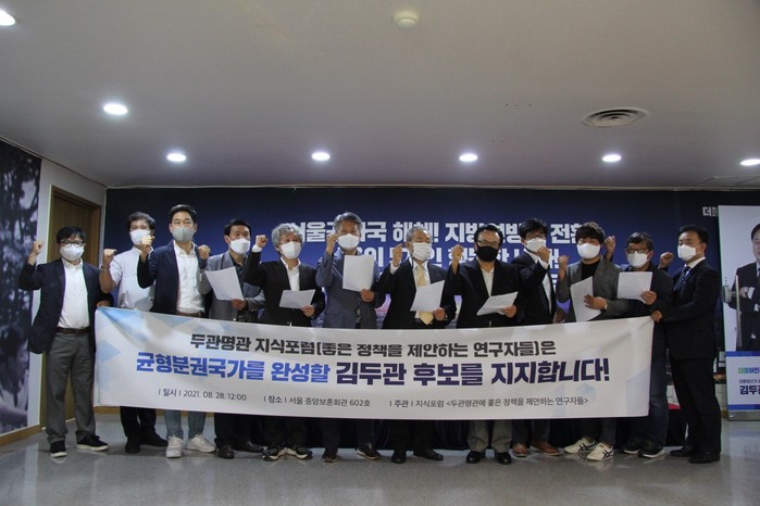 경희대학교 박영수 교수 외 교수 50명과 박사급 연구원 30명이 활동하는 ‘두관명관 지식포럼’은 정책 제안을 위해 모인 싱크탱크다. 지지선언에서 이들은 “서울공화국을 해체하고, 지방정부에 과감히 권력을 이양하는 것만이 인구소멸과 지방소멸을 막을 수 있다는 결론에 공감하였다.”고 밝혔다. 또한 “앞으로 미래세대에는 지방에서도 국가를 대표하는 전문가와 기업가들이 나올 수 있도록 하겠다는 김두관 후보를 선택했다.”고 덧붙였다.