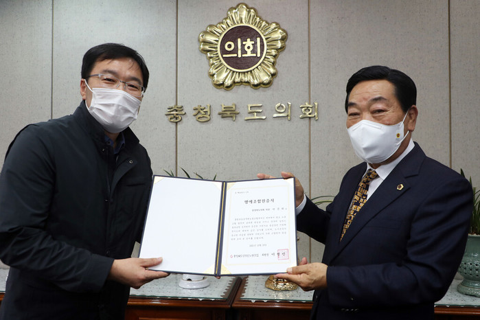 [충북=세계타임즈 이현진 기자] 충북도의회 박문희 의장은 20일 충청북도공무원노동조합(위원장 이병민)으로부터 충청북도공무원노동조합 제1호 명예조합원증서를 받았다.