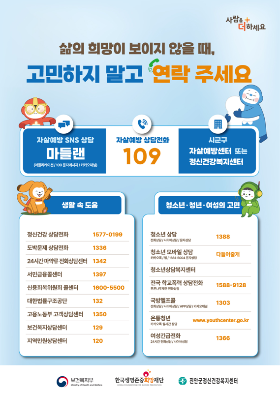 한편, 주변에 우울감으로 힘들어하거나 말하기 어려운 고민이 있어 고통받는 가족·지인이 있다면 자살예방 상담전화(109) 또는 정신건강 위기상담전화(1577-0199)를 통해 24시간 전문가의 상담을 받을 수 있다.