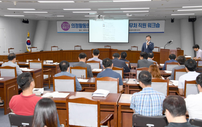 워크숍은 최민수 국회사무처 의정연수원 교수의 ‘지방의회 운영 및 의사진행방법’과 문범수 의회사무처장의 ‘일하는 방식의 혁신방법’을 주제로 한 특강과 부서별 현안업무 공유 등의 내용으로 진행됐다.