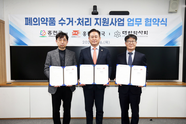 [홍천군 세계타임즈=김민석 기자] 홍천군은 3월 6일 군청 접견실에서 홍천우체국, 홍천약사회와 가정에서 발생하는 ‘폐의약품의 안전한 수거·처리’를 위한 업무 협약을 체결했다.