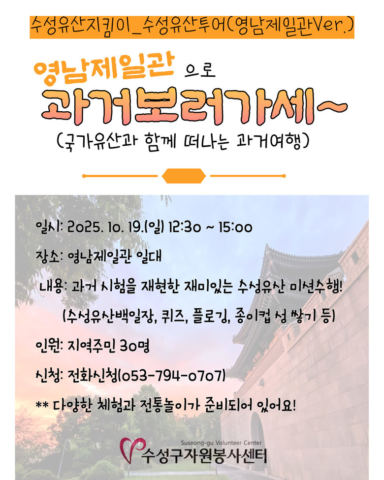 이번 프로그램은 수성구의 대표적 국가유산인 영남제일관에서 조선시대 과거시험을 재현한 체험형 역사·문화 프로그램으로, 주민들에게 전통문화를 쉽고 재미있게 접할 기회를 제공한다. 참가자들은 ▲수성유산 백일장 ▲퀴즈 ▲플로깅 ▲종이컵 성 쌓기 등 다양한 프로그램을 통해 옛 선비들의 과거시험을 체험할 수 있다.