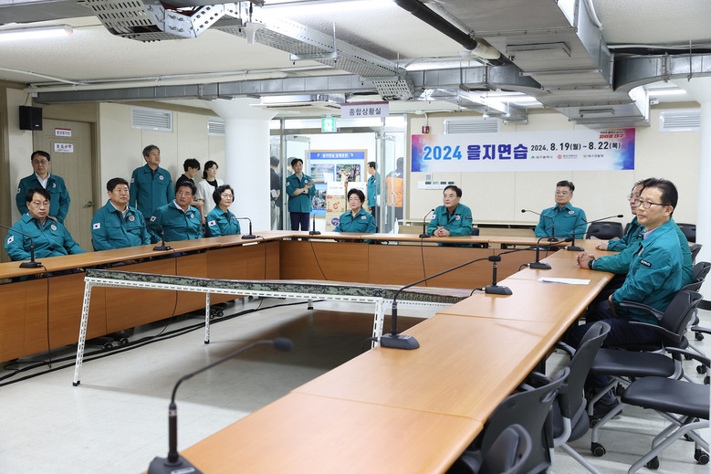 먼저 을지연습 주관 부서인 사회재난과장으로부터 을지연습 훈련 상황을 보고 받고, 공무원과 군인, 경찰 등 관계자들의 비상대비태세 상황을 면밀하게 둘러보았다.