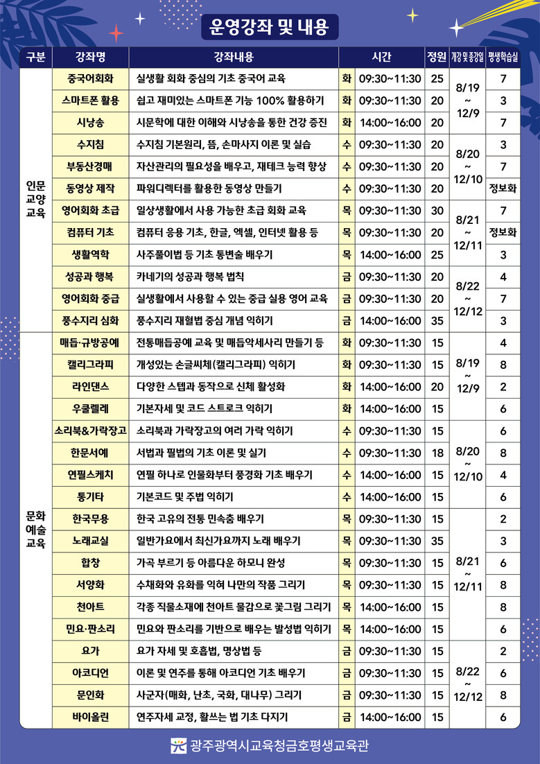 자세한 내용은 금호평생교육관 누리집 또는 운영과(062-360-6632~5)에서 확인할 수 있다.