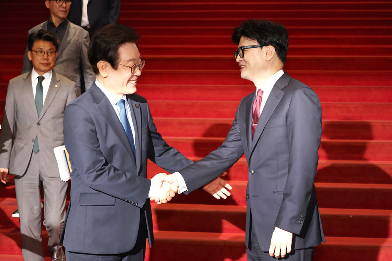 회담 마치고 인사하는 한동훈-이재명 대표