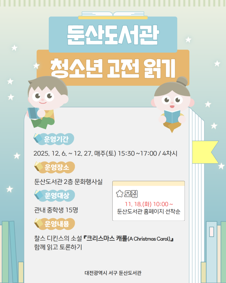 참가 신청은 11월 18일 화요일 오전 10시부터 둔산도서관 홈페이지를 통해 가능하며, 선착순 15명을 모집한다. 추가 문의는 전화(☎042-288-4808)로 문의하면 된다.