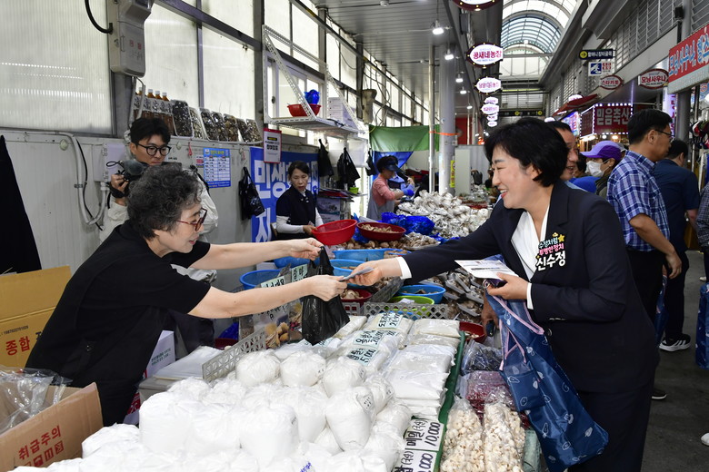 이날 신 의장은 온누리상품권과 민생회복 소비쿠폰을 활용해 장을 보며 박창순 상인회장을 비롯한 상인들과 만나 현장의 목소리를 청취하고, 추석 준비로 장을 보러 나온 시민들과 따뜻한 인사를 나누었다.