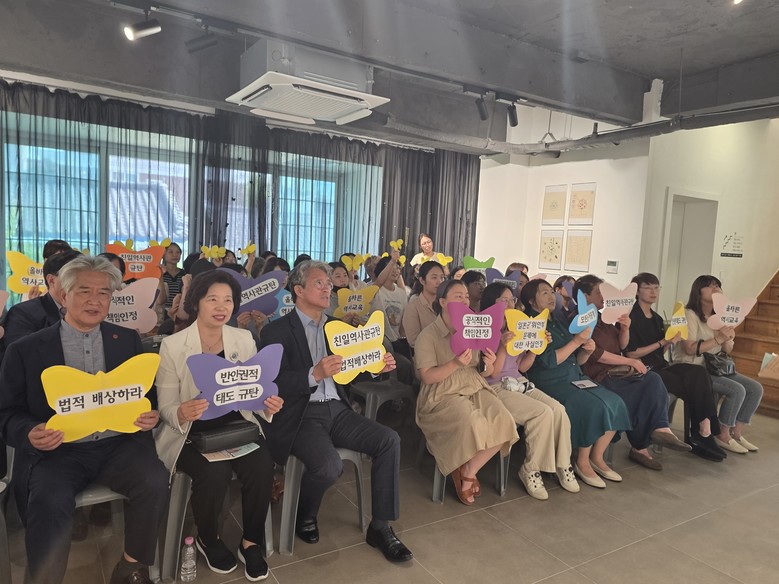 행사에는 도내 여성단체와 시민사회단체, 광복회 전북지회, 전북겨레하나 등 60여 명이 참석해 피해자들의 고통과 용기를 되새겼다. 추모사와 전시 작가 소개, 피해자를 기리는 퍼포먼스가 이어지며 현장 분위기를 더했다.