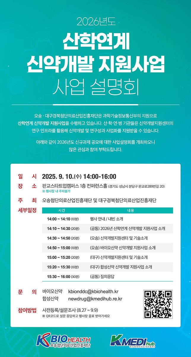 설명회에서는 ‘2026년 산학연계 신약개발 지원사업’과 신약개발지원센터 및 지원기술 소개, 신규과제 공모에 대한 질의응답 등을 진행한다.