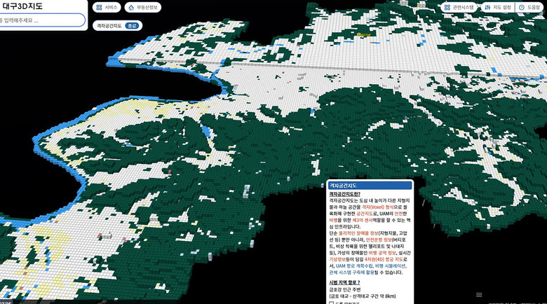 이와 함께 대구3D지도를 새롭게 개선하며 ▲시 전역의 높낮이를 표시한 경사지도, ▲지형·지물을 블록화해 도심항공교통(UAM)에 활용되는 격자공간지도, ▲드론 가상비행 시뮬레이션, ▲가상 가로수배치 기능을 추가 제공한다.