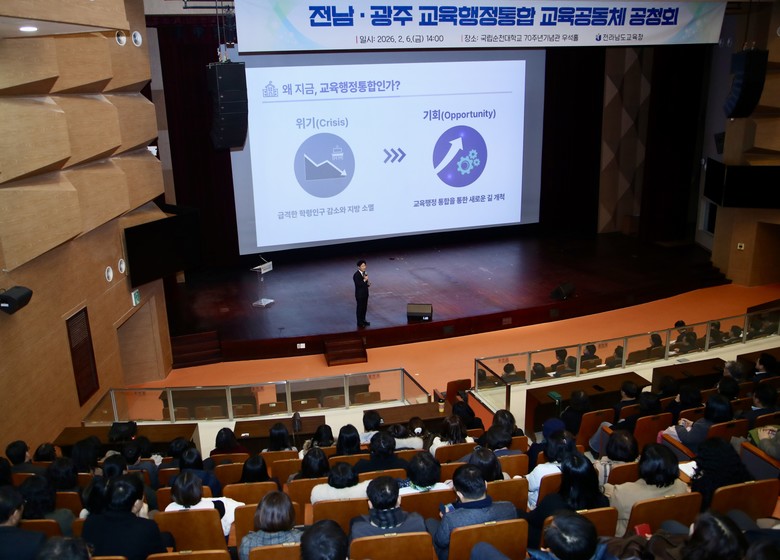 공청회에는 교직원과 학부모 등 전남교육 공동체 구성원이 참석했으며, 김대중 교육감이 직접 현장을 찾아 전남·광주 교육행정통합의 미래 비전을 설명했다.