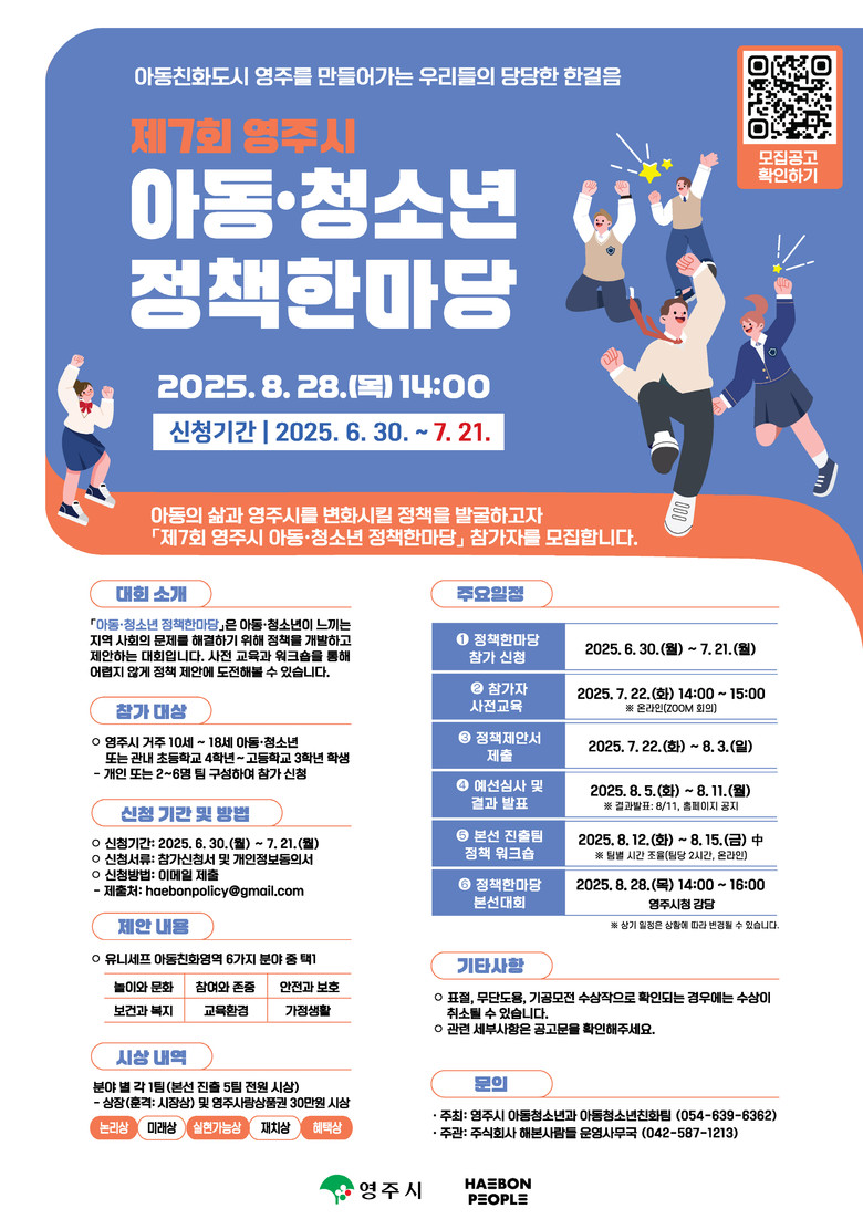 “아이들의 생각이 정책이 되는 날” [영주시 세계타임즈=한윤석 기자] 영주시는 아동‧청소년의 정책 참여 기회를 확대하기 위해 ‘제7회 아동·청소년 정책한마당’ 참가자를 오는 7월 21일까지 모집한다.