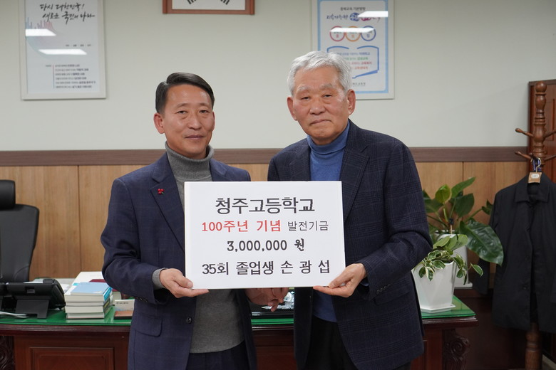 이에, 지성훈 청주고등학교장은 “청주고등학교 발전을 위해 발전기금을 기탁해주신 손광섭 대표님께 감사드린다.”며 “대표님의 깊은 뜻에 힘입어 지혜롭고 진취적이며 명예로운 청고인 육성에 최선을 다하겠다.”고 말했다.