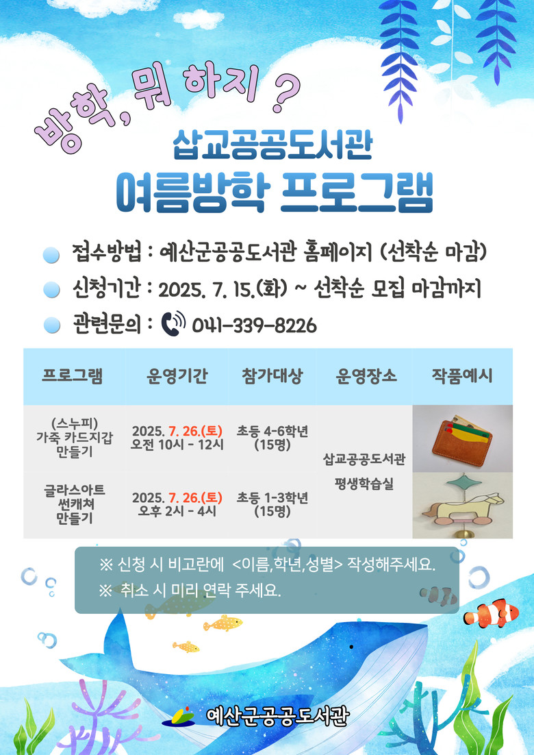 프로그램 참가 신청은 7월 15일 오전 9시부터 공공도서관 누리집(www.ysplib.go.kr) ‘참가신청’ 메뉴를 통해 가능하며, 행사 일정 등 자세한 사항은 누리집을 참고하거나 전화(041-339-8226)로 문의하면 된다.